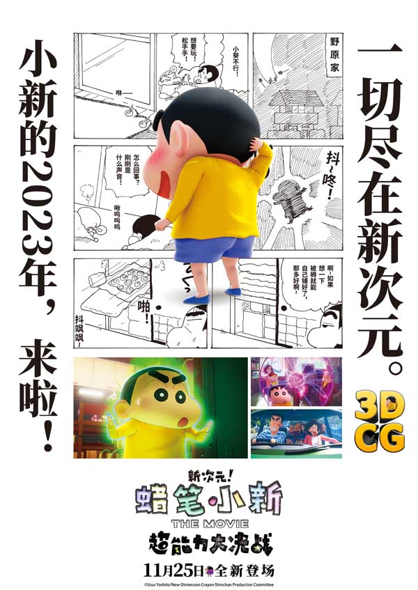 由大根仁编剧及执导、臼井仪人原作的《蜡笔小新:新次元!超能力大决战》今日发布了漫画版海报,此前该剧场版已宣布定档11月25日在全国上映,定档消息一出便在全网备受粉丝观众关注,热度也持续攀高,让人期待不已。影片主要讲述了新之助意外获得了超能力,而与新之助的超能力一同到来的,还有一场关乎世界命运的重大危机!新之助能否使用超能力拯救世界?让我们一同去影院揭晓答案!