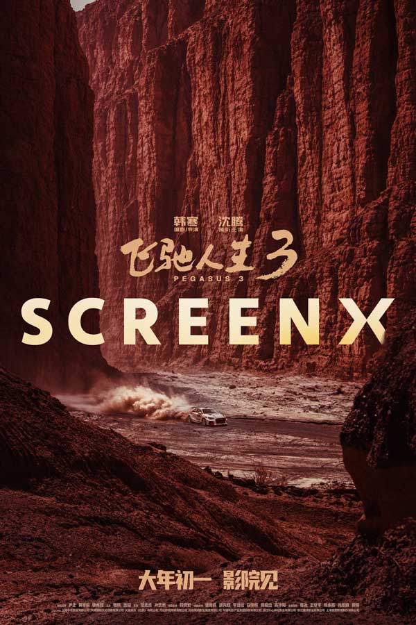 IMAX制式海报中,赛车在壮阔的沙地上急速飞驰,车尾卷起滚滚沙尘,拖出长长轨迹,将竞速感拉满之余,亦让人大开眼界。CINITY制式海报聚焦比赛冲线的激烈场面,在经历漫长征途之后,赛车的车况并不完美,但终点已然在望,引擎不熄,斗志不灭。中国巨幕制式海报呈现了神奇的雅丹地貌,天地辽阔壮美,张驰和孙宇强并肩而行,每一步都充满坚定与热血。杜比影院制式海报采用对称构图,一条笔直的赛道在戈壁滩上延伸,张驰驾驶的赛车迎面而来,让人仿佛听到引擎的轰鸣与风的呼啸。SCREENX制式海报中,连绵的深红山脉高耸,极具视觉冲击力,赛车无惧复杂地形,气势磅礴地穿梭其间,临场感十足。HDR LED制式海报中,赛车在原始的砂石路面上疾驰,车尾灯光犹如喷薄而出的尾焰,尽显一往无前的气势。DTS:X制式海报和4DX制式海报则选用了赛车雨中漂移的画面,聚光灯下这辆车就是这条赛道上的主角,车尾摆动溅起雨水,仿佛一场酣畅淋漓的热舞。更大的银幕、更鲜活的色彩、更逼真的声音,多种特效制式将在马年新春带给观众一场身临其境的大银幕飞驰体验!