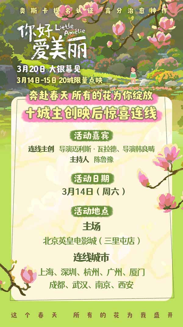 今日释出的“春日暖阳”海报中,爱美丽张开双臂平躺在大地上,沐浴阳光,眼里充满对于世界的好奇,和煦的春光也透露着影片温柔治愈的基调,令观众感受童真的纯粹与生命的美好。同步发布了导演迈利斯·瓦拉德、导演韩良畴给中国观众的独家问候视频,两位导演亲切地向内地观众问好,发出诚挚的观影邀约,映后隔空畅谈幕后创作趣事,一同度过一个惬意的春日午后。 3月14至3月15日,电影将在上海、北京、杭州、深圳、南京、武汉、广州、厦门、成都、西安、长沙、昆明、天津、贵阳、大连、青岛、海口、济南、南宁、重庆开启全国二十城限量点映,3月14日点映期间,北京、上海、深圳、杭州、广州、厦门、成都、武汉、南京、西安十城将举办映后连线活动,邀请知名主持人陈鲁豫与导演迈利斯·瓦拉德、导演韩良畴进行线上连线对谈。本周末走进影院享受一段温馨治愈的时光,与爱美丽一起迎接崭新春天吧!