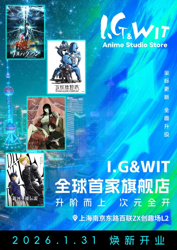 国际知名动画制作公司Production I.G & WIT STUDIO(总部:东京武藏野)官宣,1月31日其全球首家旗舰店将全面焕新升级!为提供更优质的购物与互动体验,店铺将从上海南京东路百联ZX创趣场一层搬迁至二层,并于焕新后以更大空间、更多IP、更全商品、更沉浸互动体验和更丰富的活动迎接广大粉丝,升阶而上,全面升级。